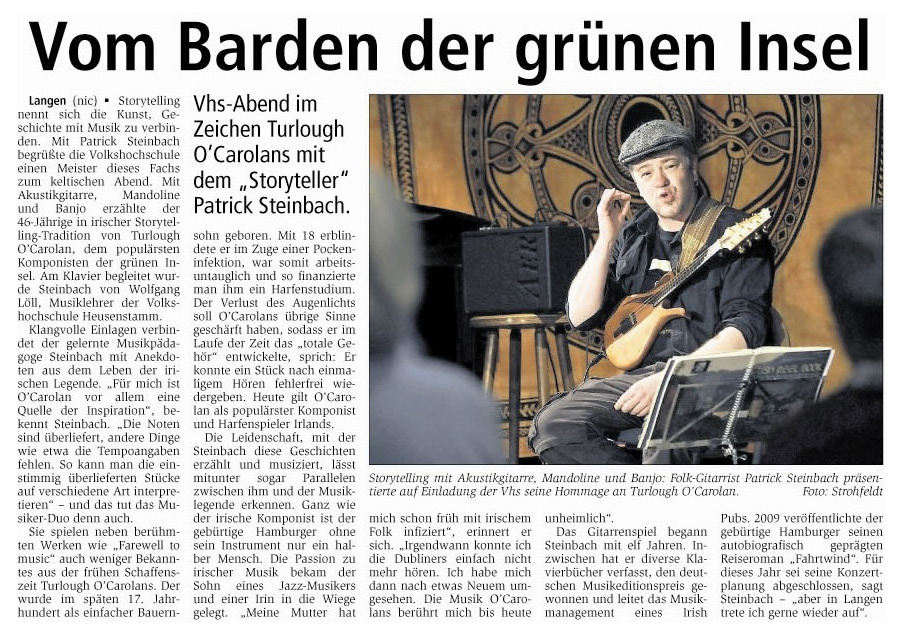 Die aktive Suche nach einem Verlag, der sein Werk in größerer Auflage herausgibt, hat Steinbach erst einmal aufgeschoben. Kürzlich war er auf der Buchmesse Klinkenputzen – eine sehr frustrierende Erfahrung, wie er berichtet. Denn Steinbach ist zwar als Autor etabliert, hat aber bisher keine Romane, sondern Notenbücher geschrieben – 16 an der Zahl. Für sein „Irish Reel Book“ erhielt er 2005 den Deutschen Musikeditionspreis.